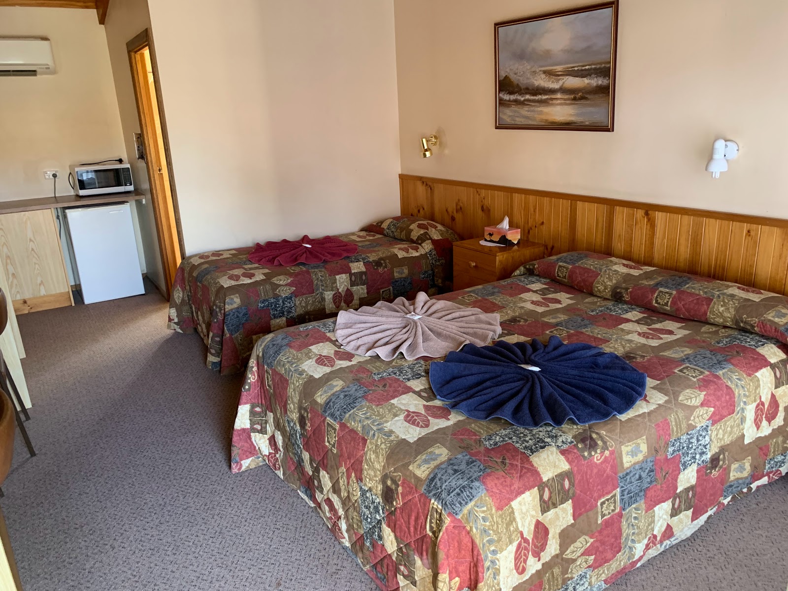 Good older style room. Spacious, spotless, toaster, kettle and microwave, . A good addition would be wine glasses and a hairdryer please!