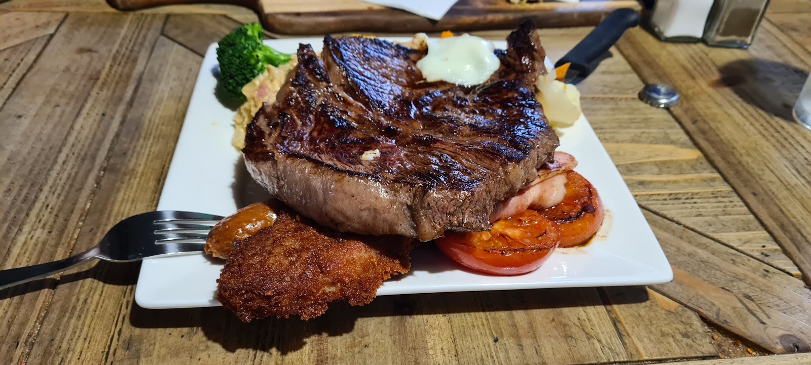 Fantastic meal after a long day travel. Huge meals! The veges were cooked perfectly. Also with the wide streets around the pub it was easy parking with a trailer.