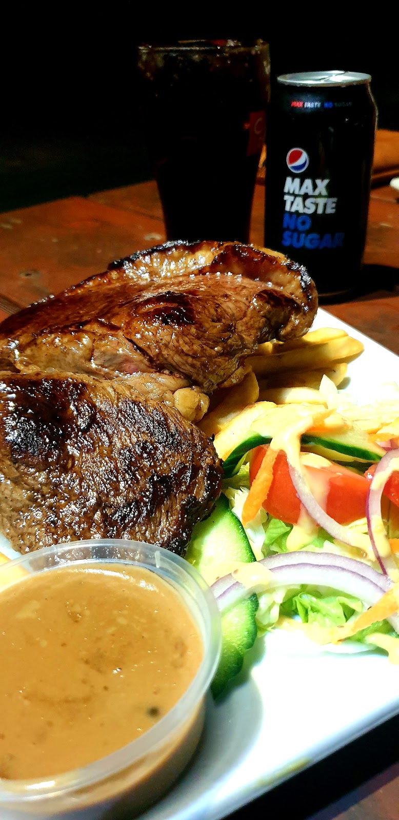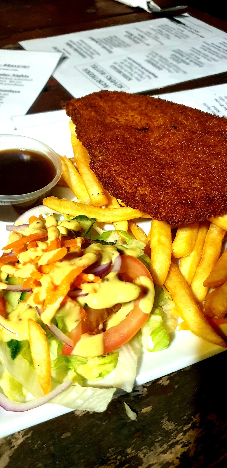 Last night we had real pub at great prices, served quickly and all meals were delicious. Pizza served in a box so it was easy to take the leftovers home.