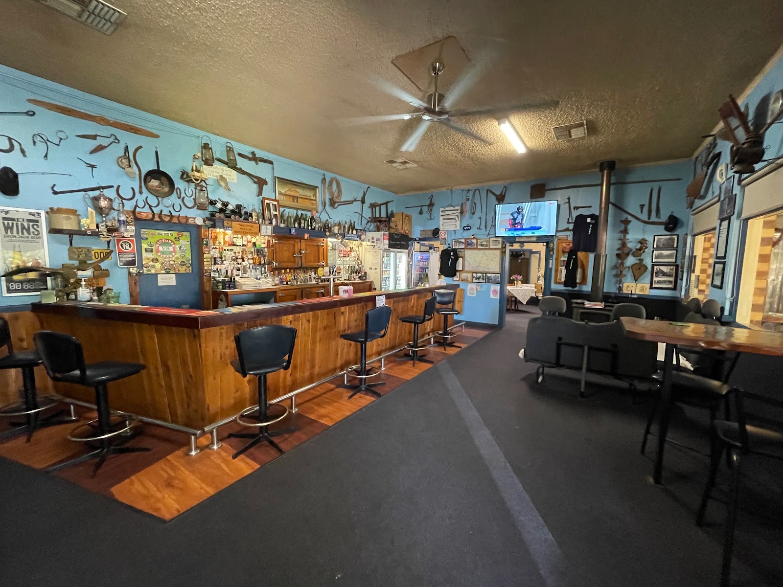 Quaint old fashion pub lots of memorabilia cold beer good food free camping at back of pub