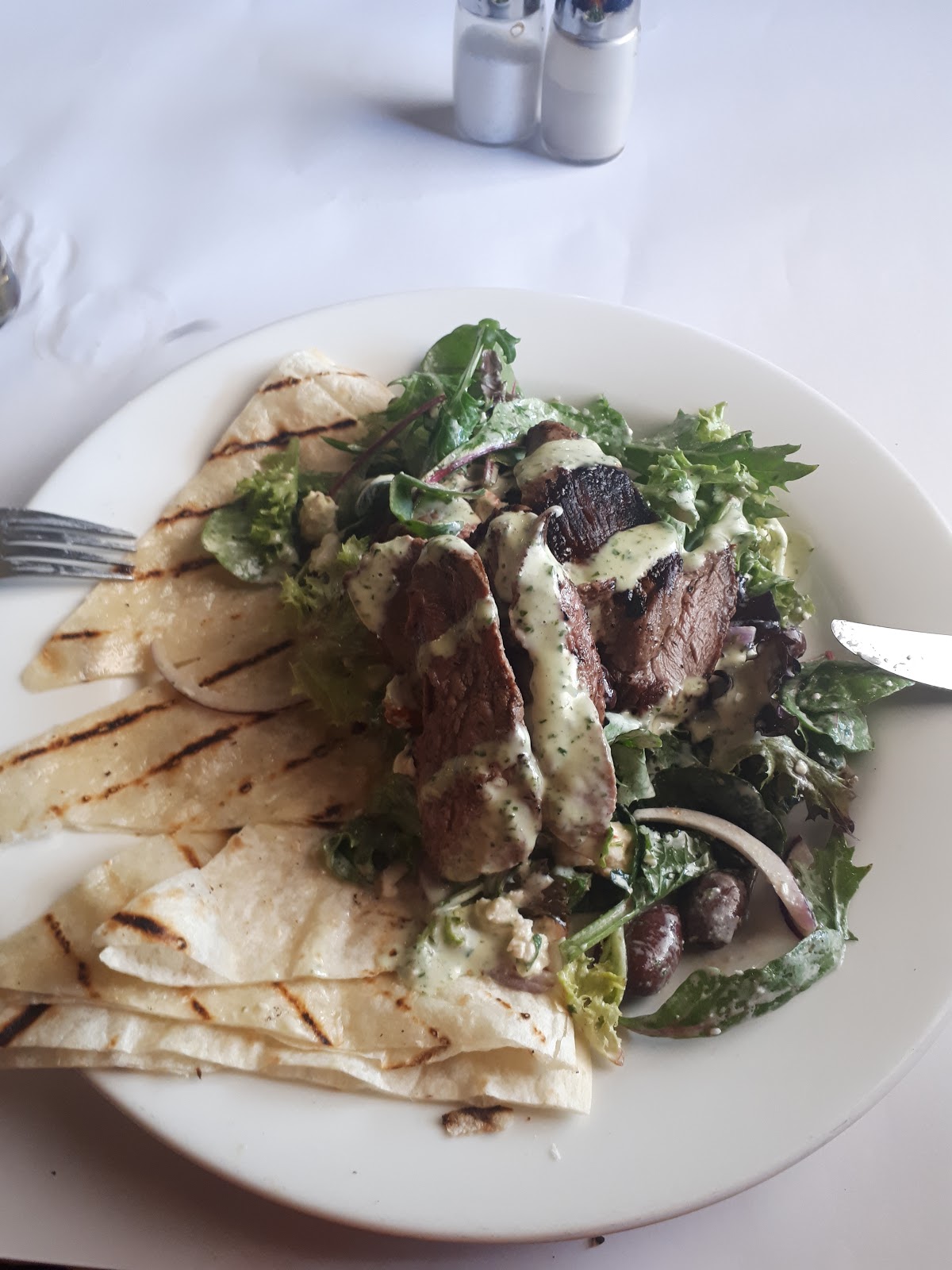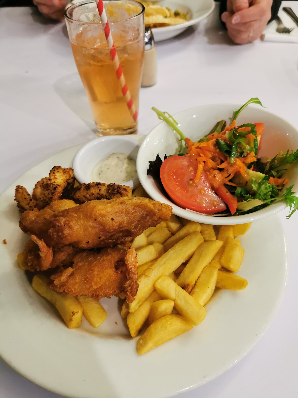 The staff were pleasant enough but the dish I had was a real let down. I ordered the seafood plate... The fish was so over cooked the fish crumbled and Prawn cutlets were very small almost all crumb with a tiny piece of Prawn on a very over cooked tail. The chips were just warm and very dry the salad was limp but the dressing was nice. All in all not a good experience in a meal. You be the judge if you go.