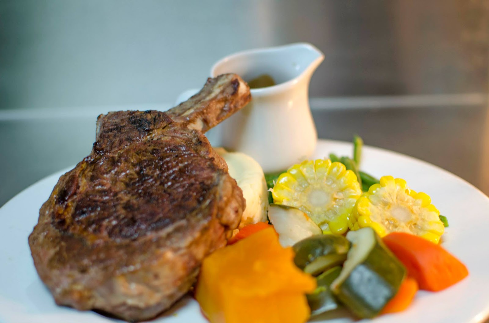 Char grilled with Spanish style roasted sweet potato, corn on the cob, battered onion rings and a red wine jus