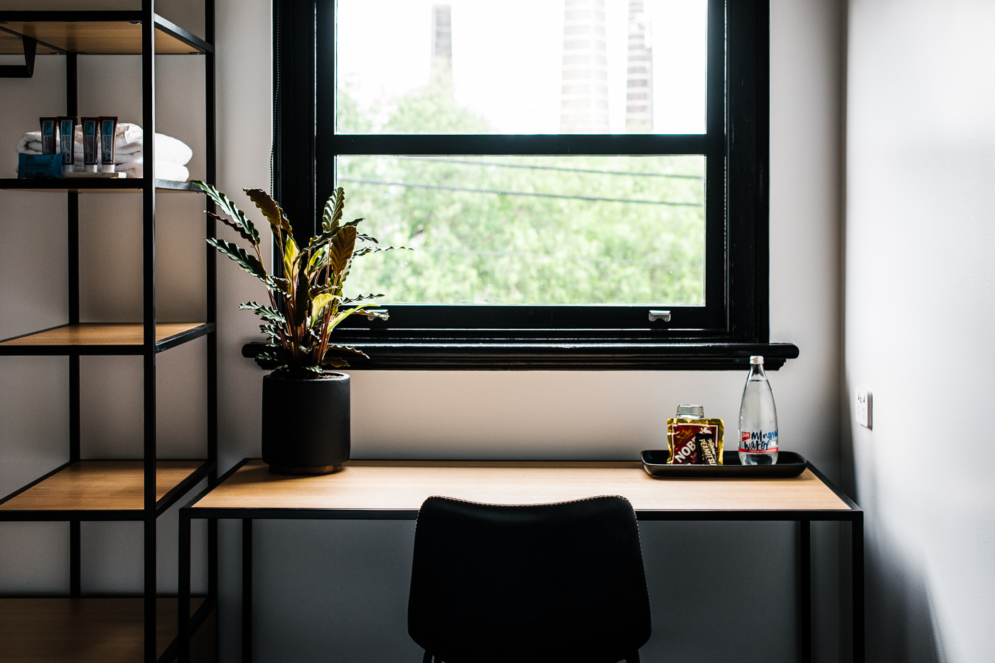 Modern rooms with shared bathrooms in a hip boutique hotel featuring a warm pub.