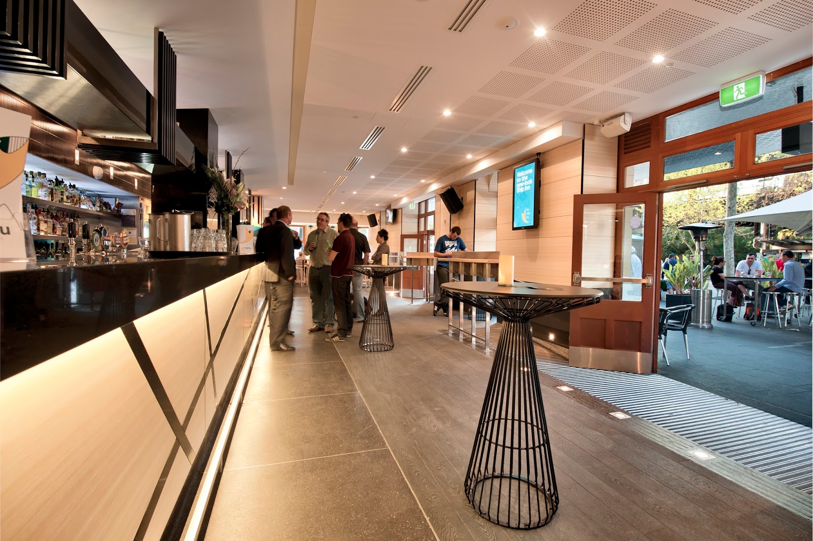 A modern bar and pub with outdoor tables, offering gourmet pizza, salads, wraps and cocktails.